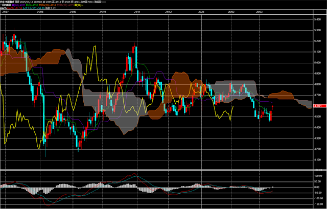 【OSE金標準先物 日足】NY金4月限は前日比25.9ドル高の2946.8ドルのセツルメント。米2月CPIではインフレ鈍化の傾向が示されましたが、今後は2月初旬に発動した対中関税や、カナダ、EUとの関税報復合戦への警戒から再びインフレ圧力が強まるとの見方も指摘されています。NY総取組高の増減は2月に54万枚台から50万枚割れまで減少し、直近3/3時点の488,842枚をボトムにして、3/11時点で511,276枚に増加してきています。ポジション整理による売りは一巡し、再度買い直されてきている様子がうかがえます。ドル安傾向が強まることで3000ドルを目指す勢いがつくかどうか?国内円建てのOSE金標準先物2月限は前日比160円高の14123円(12:00)で推移し2日続伸。週明け13673円(11日10:04)までドル安円高を背景に売り込まれましたが、2営業日で400円以上の切り返し。来週19日の日銀金融政策決定会合での日銀追加利上げ観測によって投機筋による円買いが歴史的過去最高水準まで膨らんでいます。米国では景気後退が警戒されるなか、CPIなども目先ボトムとなり再度インフレへの警戒が強まる可能性も出てきました。再び強いトレンドが形成される展開となりそう・・・。